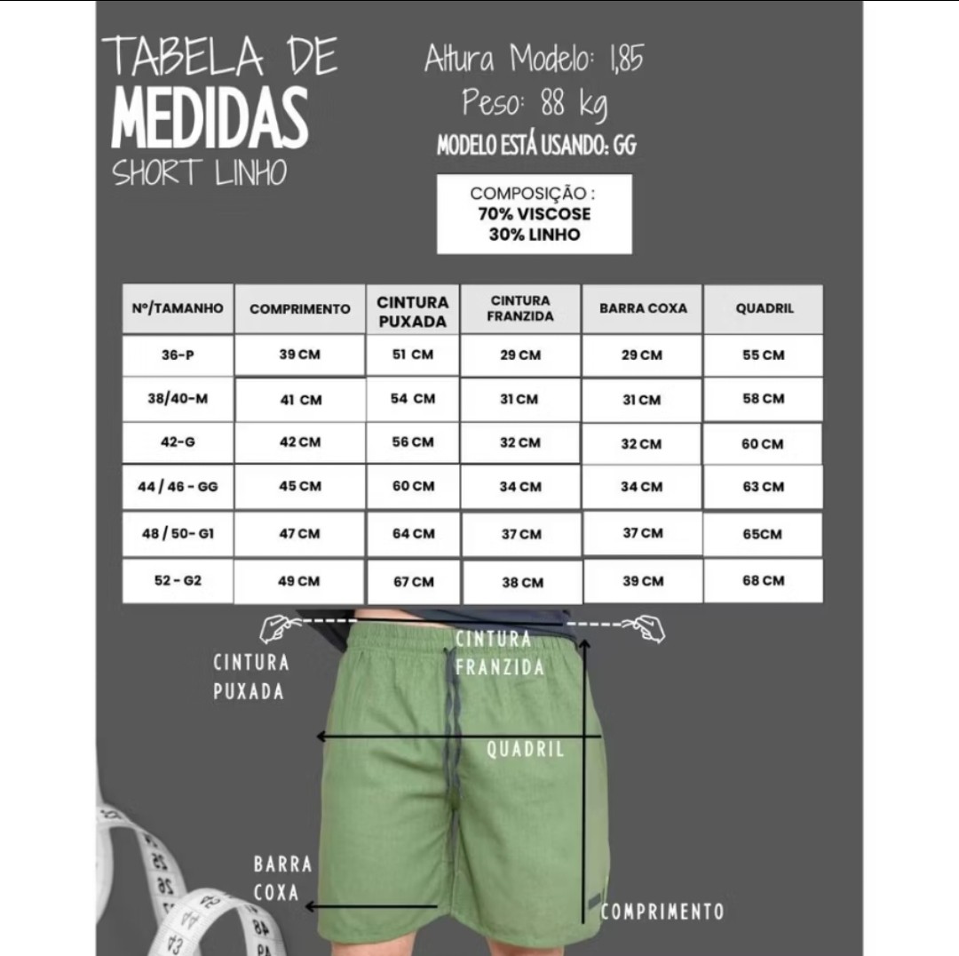 Caimento Confortável: Geralmente, as bermudas de linho possuem um corte mais solto e reto, que oferece total liberdade de movimento. A cintura pode ser elástica, com cordão ajustável ou ter passantes para cinto, adaptando-se a diferentes biotipos e preferências.